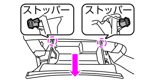 左右のストッパーを片方ずつ外し、グローブボックスを取り外します。