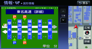 本機ではVICSで提供された最新の情報を地図上に重ねて表示したり、文字や道路図などの形で画面に表示できます。