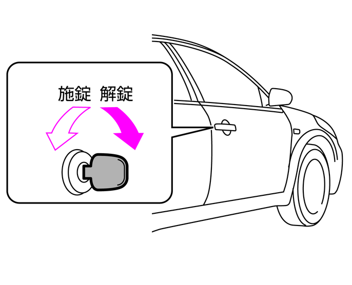 運転席ドアにある鍵穴にキー(メカニカルキー)を差し込んで車両前方にキー(メカニカルキー)を回すと解錠します。施錠するときは、車両後方にキー(メカニカルキー)を回します。