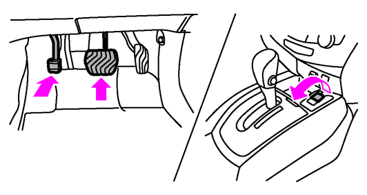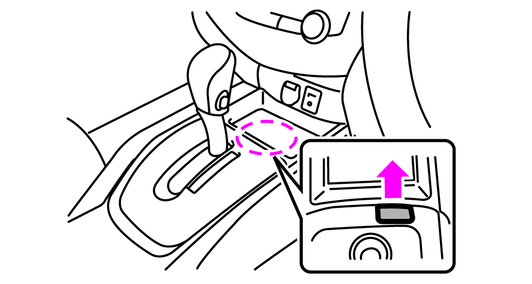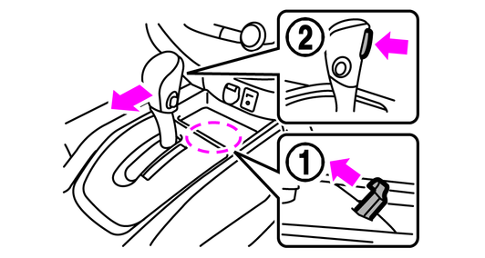 キー(メカニカルキー)または、お手持ちのマイナスドライバーなどを差し込んだまま矢印の方向に上げ(1)、ロックを解除してからセレクトレバーのボタン(2)を押して動かします。