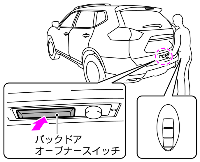 バックドアが施錠時にキー(インテリジェントキー)を携帯し、バックドアオープナースイッチを押すとバックドアが自動的に開きます。