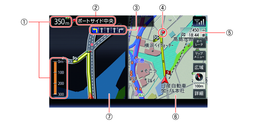 - 現在地から目的地または経由地までの距離および到着予想時刻を表示します。