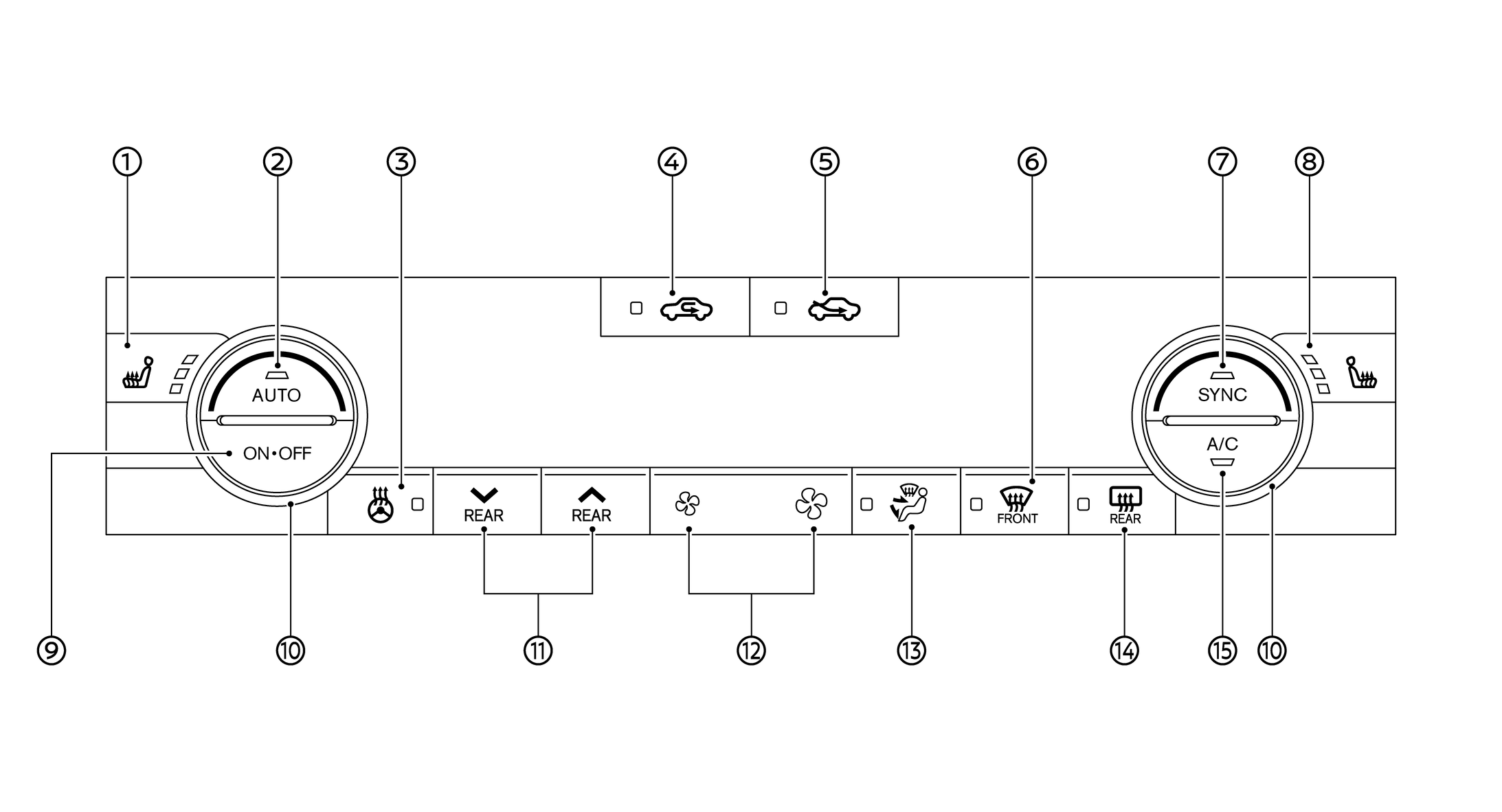 スイッチを押して後席の設定温度を切り替えます。SYNCモードがONのときは、運転席側で温度を調節すると後席側も同時に温度調節します。(Lo 18.0°C~32.0°C Hi)