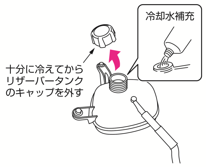 エンジンが十分に冷えていないときは、リザーバータンクのキャップを外さない。