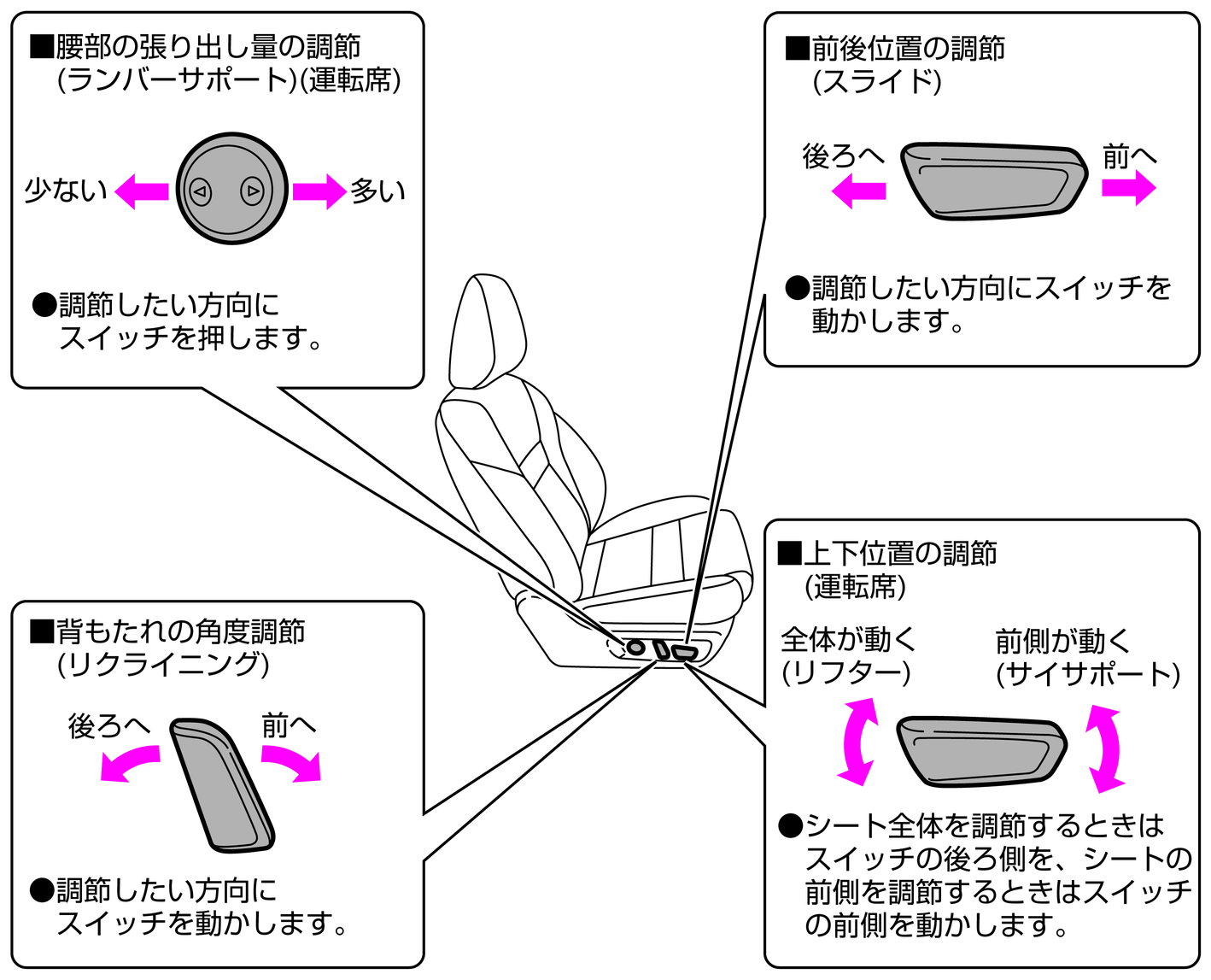 シートを調節するときは、動いている部分に手や足などを近づけない。