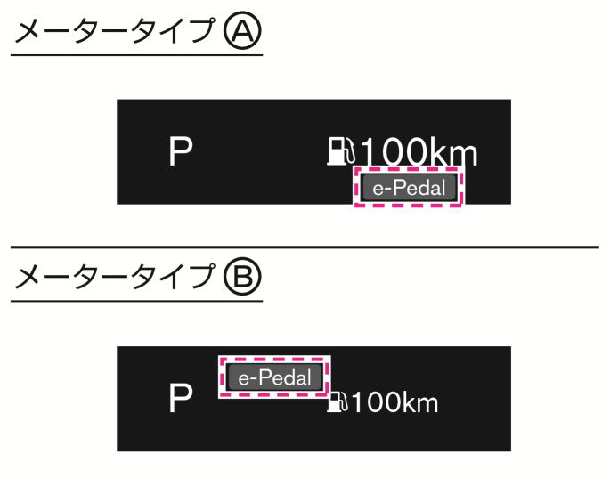 <e-Pedal>スイッチを押してe-Pedal StepをONにすると[e-Pedal]と表示し、e-Pedal StepがOFFのときは、[e-Pedal OFF]と表示します。