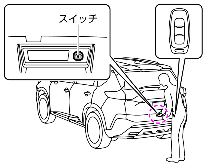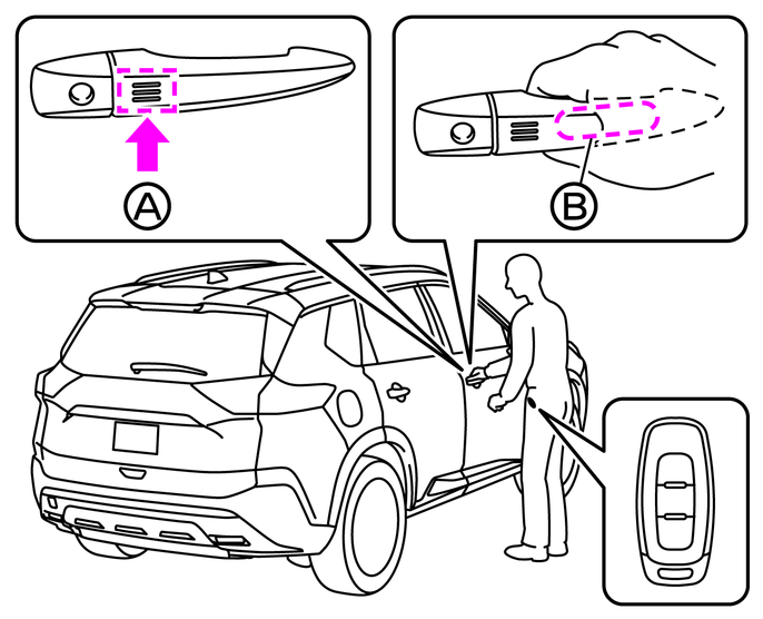 解錠するときは、バックドアにあるスイッチを押すか運転席または助手席ドアのドアハンドルを握ります。ドアハンドル裏側のタッチセンサー(B)に触れるようにドアハンドルを握ると解錠されます。(施錠した直後の約2秒間は解錠できません)