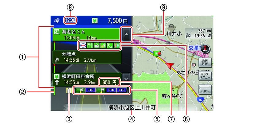 - ルートに有料道路があるときは、目的地までの料金総額が表示されます。ただし、料金は目安です。