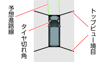 予想進路線はリヤワイドビュー、ハンドルが中立位置のリアビューには表示されません。