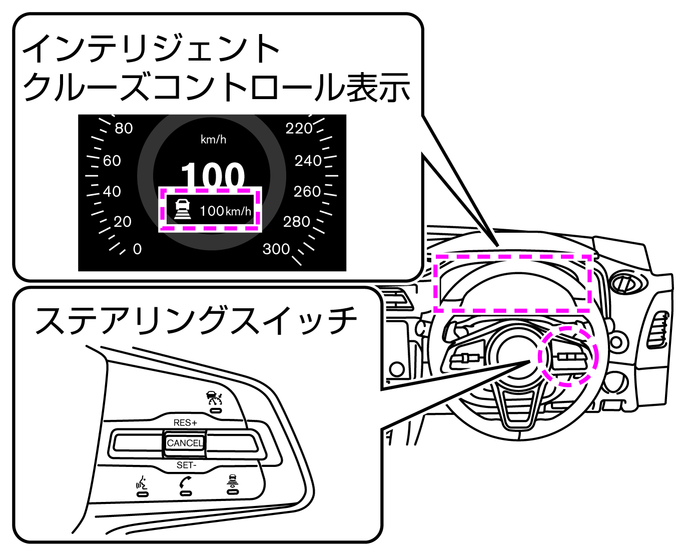 インテリジェント クルーズコントロールは、高速道路や自動車専用道路の直線や緩やかなカーブでの使用を想定して設計されています。一般道での使用は思わぬ事故につながるおそれがありますので使用しないでください。