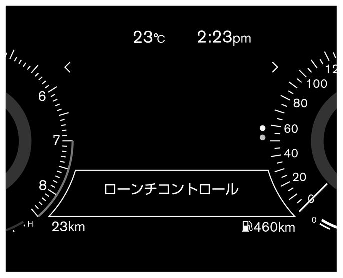 ローンチコントロールと表示されているときに、ステアリングスイッチのCANCELスイッチを6秒以内にRES+方向、またはSET-方向に押すことで、設定エンジン回転数を変更できます。(CANCELスイッチを操作するごとに、500rpm変更されます)