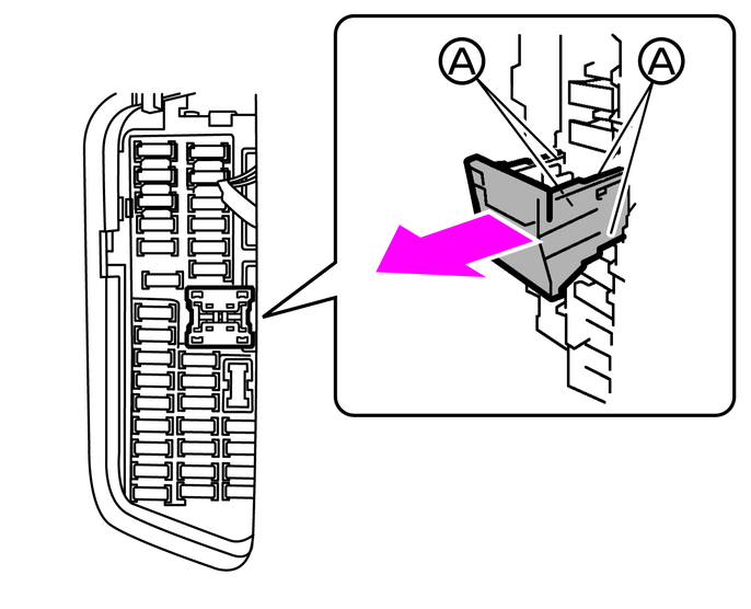 イラストのような部品が付いている場合は、その部品の中にもヒューズがあります。中のヒューズを点検・交換するときは、(A)を上下につまみながら矢印の方向に引き抜いてください。