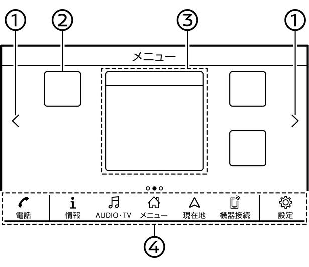 <メニュー>ボタンを押すと、メニュー画面を表示します。メニュー画面はお好みに応じて編集することができます。
