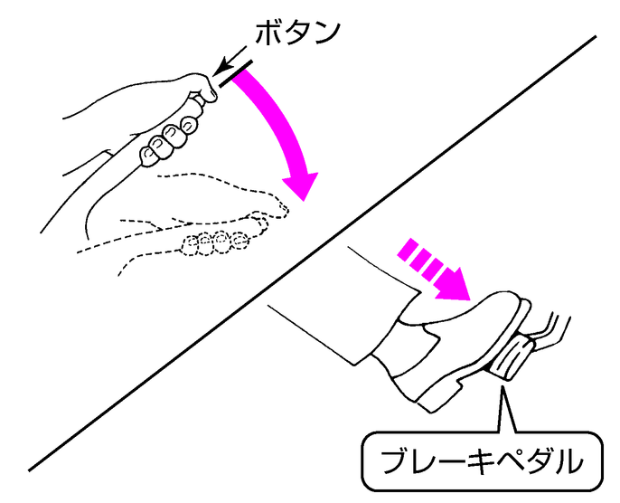 右足でブレーキペダルを踏みながら、左手でパーキングブレーキレバーを少し引き上げながらボタンを押し、レバーを戻します。