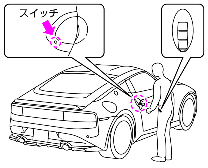 キーを携帯し運転席、助手席ドアにあるスイッチを押すと、運転席と助手席のドアが施錠・解錠します。