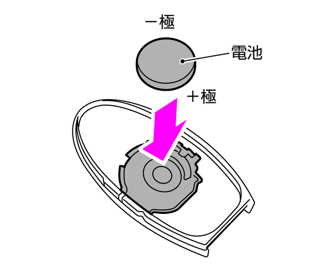 • 3. 消耗した電池を取り外し、新しい電池をはめ込みます。(新しい電池は、+ 極を下にして取り付けてください。)