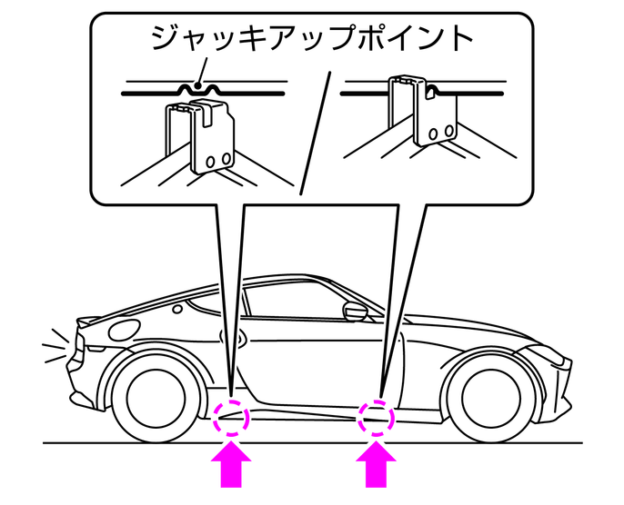 ジャッキアップポイント以外のところにはジャッキをかけないでください。車体が変形するおそれがあります。