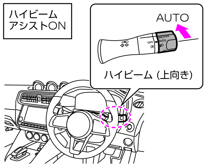 ライトスイッチがAUTOの位置でレバーを車両前方に押すと、ハイビームアシストがONになります。(メーター内のハイビームアシスト表示灯