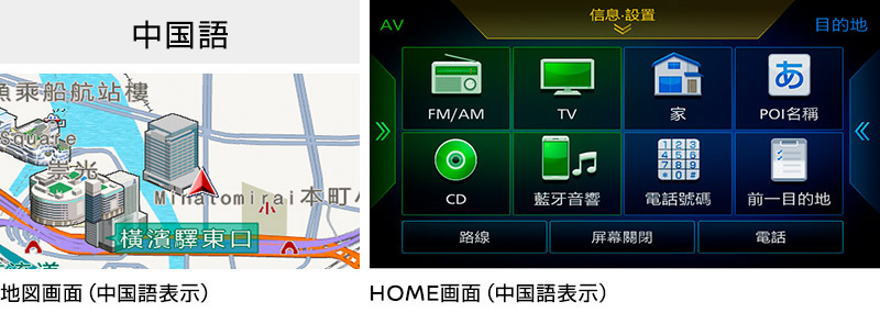 ○ メニュー画面+音声ガイド+地図画面に対応/中国語/韓国語の計4ヶ国語に対応