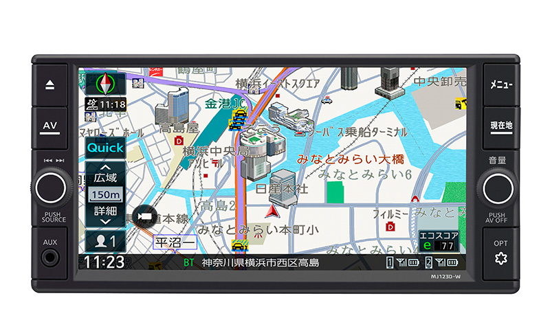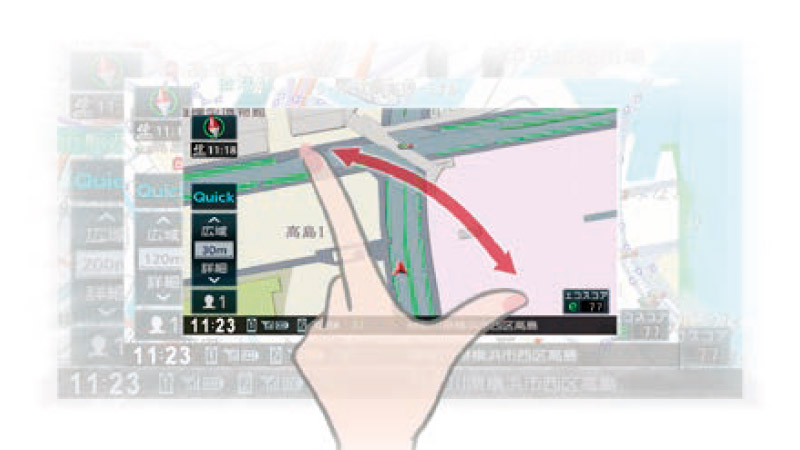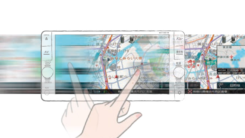 シンプルな操作性と高速レスポンスで、サクサク快適に使えるナビ画面。AV機能にもシークバー、車速連動音量など便利な機能を搭載。