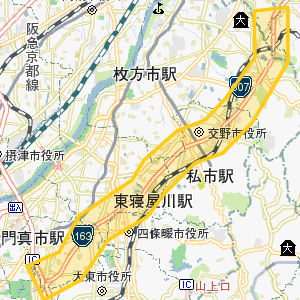 | 大阪府 | 高速有料道路 | 第二京阪道路 | 枚方東IC~枚方学研IC~交野北IC~交野南IC~寝屋川北IC ~寝屋川南IC~第二京阪門真IC~門真JCT(16.9km) |