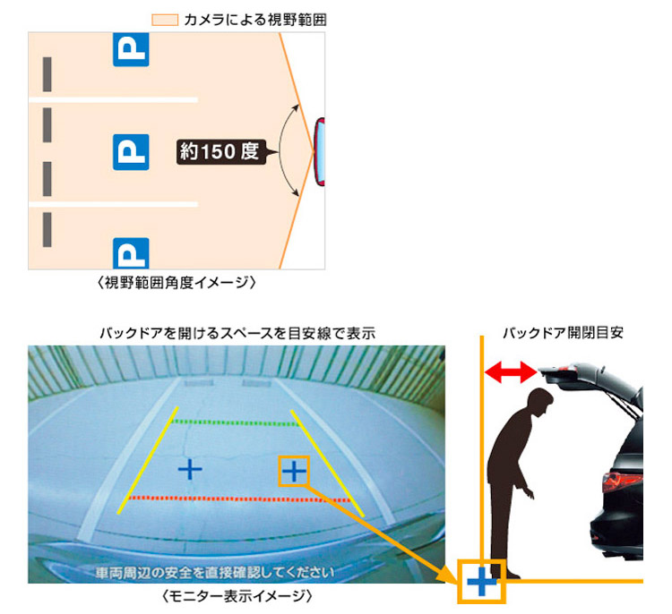 シフトレバーを「R」にすると、見えにくい後方の映像をナビ画面に表示。日産純正ならではの車幅がつかみやすい「目安線表示」や、バックドアを開く余裕を残した駐車を可能にする「バックドア開閉目安点表示」を搭載し、視野角度をより広角化することで、広範囲の視野を確保しています。