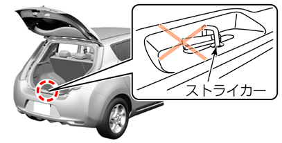 • バックドアを閉めるときは、ストライカーに異物をかみ込まないようにしてください。ストライカーやバックドアのロックが破損し、バックドアが閉まらなくなるおそれがあります。