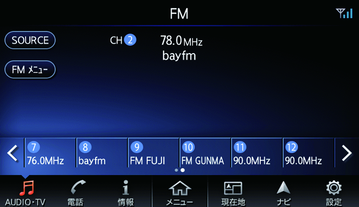 FM・AMを押すごとに、オーディオソースがラジオになり、AM、FMが切り替わります。