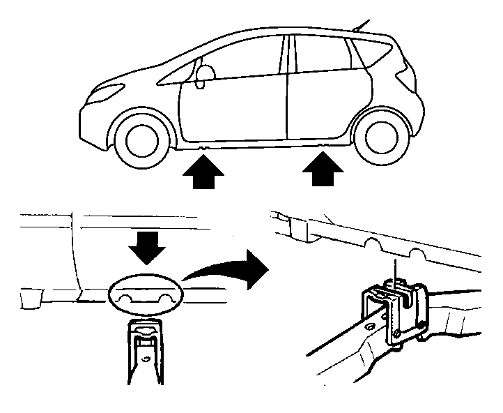 ジャッキのヘッドを図のように前側または後ろ側ジャッキアップポイントの2個のくぼみ間に合わせます。