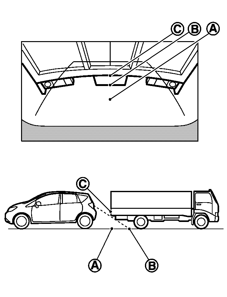 (C)の位置は(B)の位置よりも遠くにあるように見えますが、実際は(A)の位置と同じ距離です。トラックの車体が実際の進路上に張り出している場合は、(A)の位置まで下がるとぶつかることがあります。