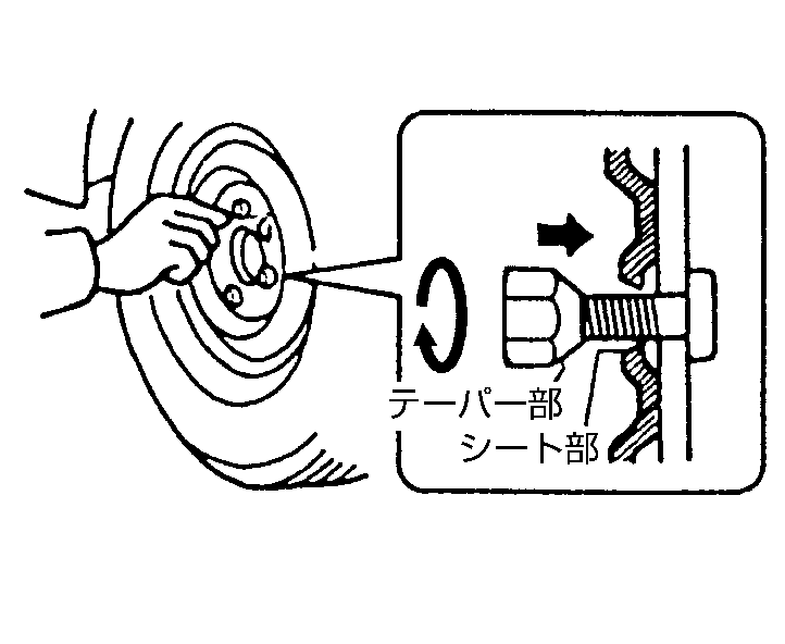 ナットのテーパー部が、ホイール穴のシート部に軽く当たるくらいまで、時計回りに回して締め付けます。