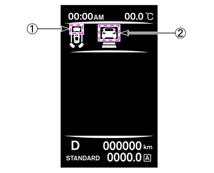 メーター内のディスプレイの(1)および(2)を黄色に点滅させるとともにブザーを鳴らして警告を行います。