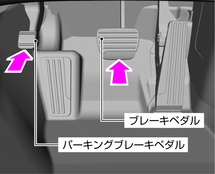 パーキングブレーキをかけるときは、右足でブレーキペダルを踏みながら、左足でパーキングブレーキペダルをいっぱいに踏み込みます。