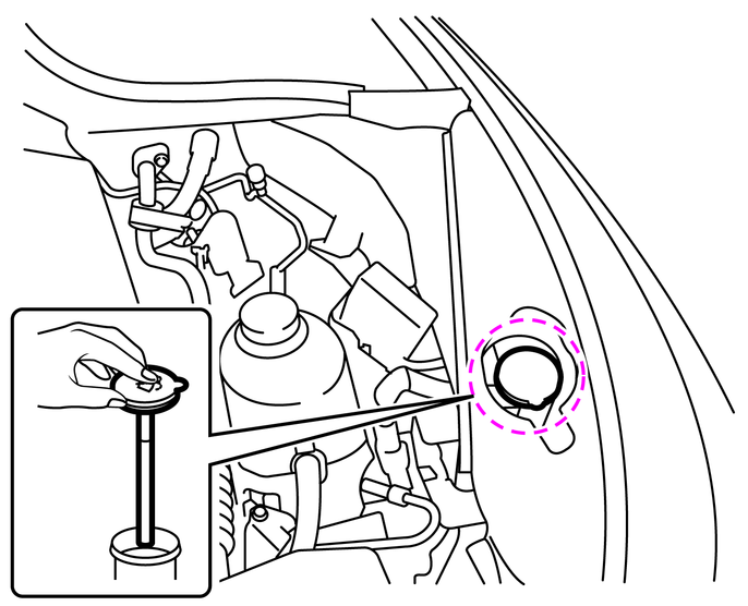 • ふたの穴を押さえ、引き抜くと、スポイト式にウォッシャー液の残量が点検できます。