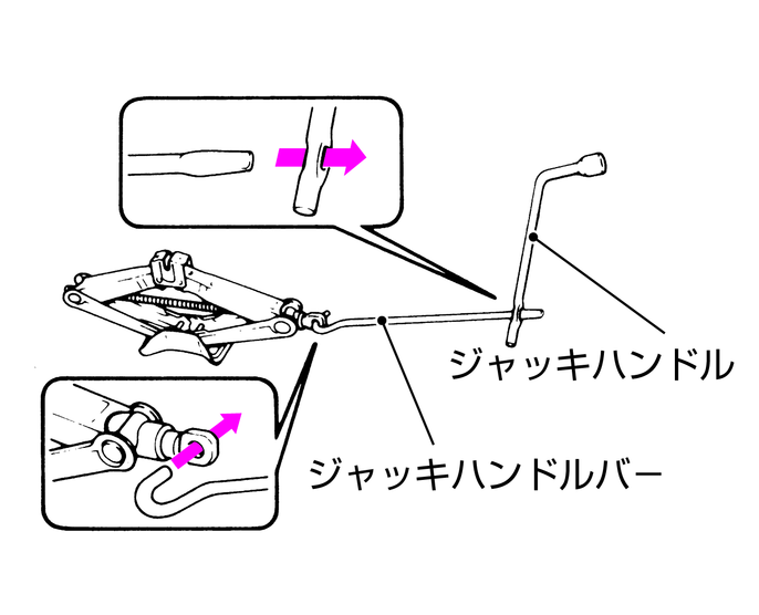 • ジャッキハンドルバーは、確実にジャッキハンドルの穴に差し込んでください。