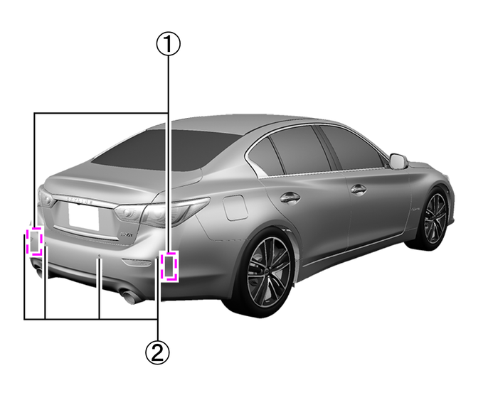 BCI(後退時衝突防止支援システム)は リヤバンパー付近に取り付けられたレーダーセンサー(1)により、後方を横切ろうとする車両を検知します。また、リヤバンパーに取り付けられたソナーセンサー(2)により、後方の障害物を検知します。