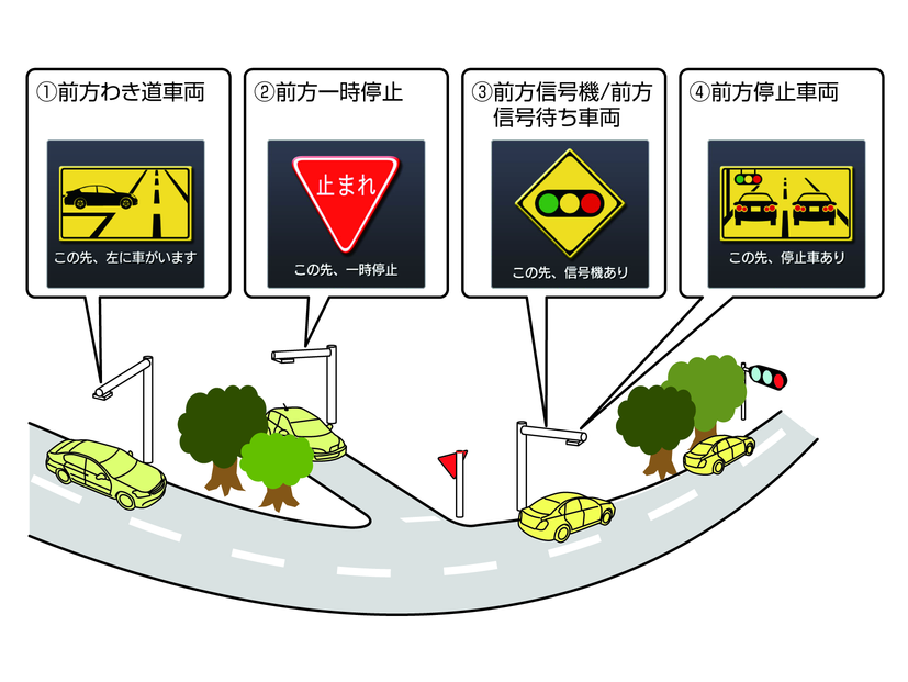 前方のわき道車両や信号待ち車両の存在を検出する路上に設置したセンサーが、環境条件変化などによって、検出機能が低下し、車両の未検出や誤検出が発生した、またはDSSS用光ビーコンを通過してから、ガイド対象地点に進むまでに、わき道車両や信号待ち車両の状況が変化したとき。