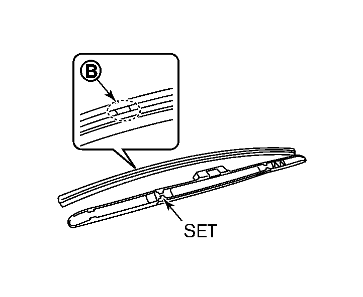 ワイパーゴムの(B)部をワイパーブレードの「SET」の位置で確実に押し込み、固定します。