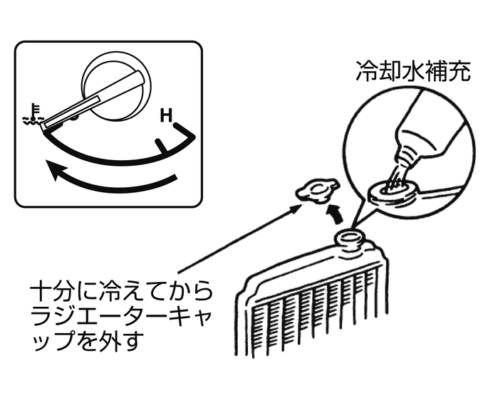 走行中、再度水温計がオーバーヒートの範囲を示したときは、手順1~手順4の作業を繰り返し行ってください。