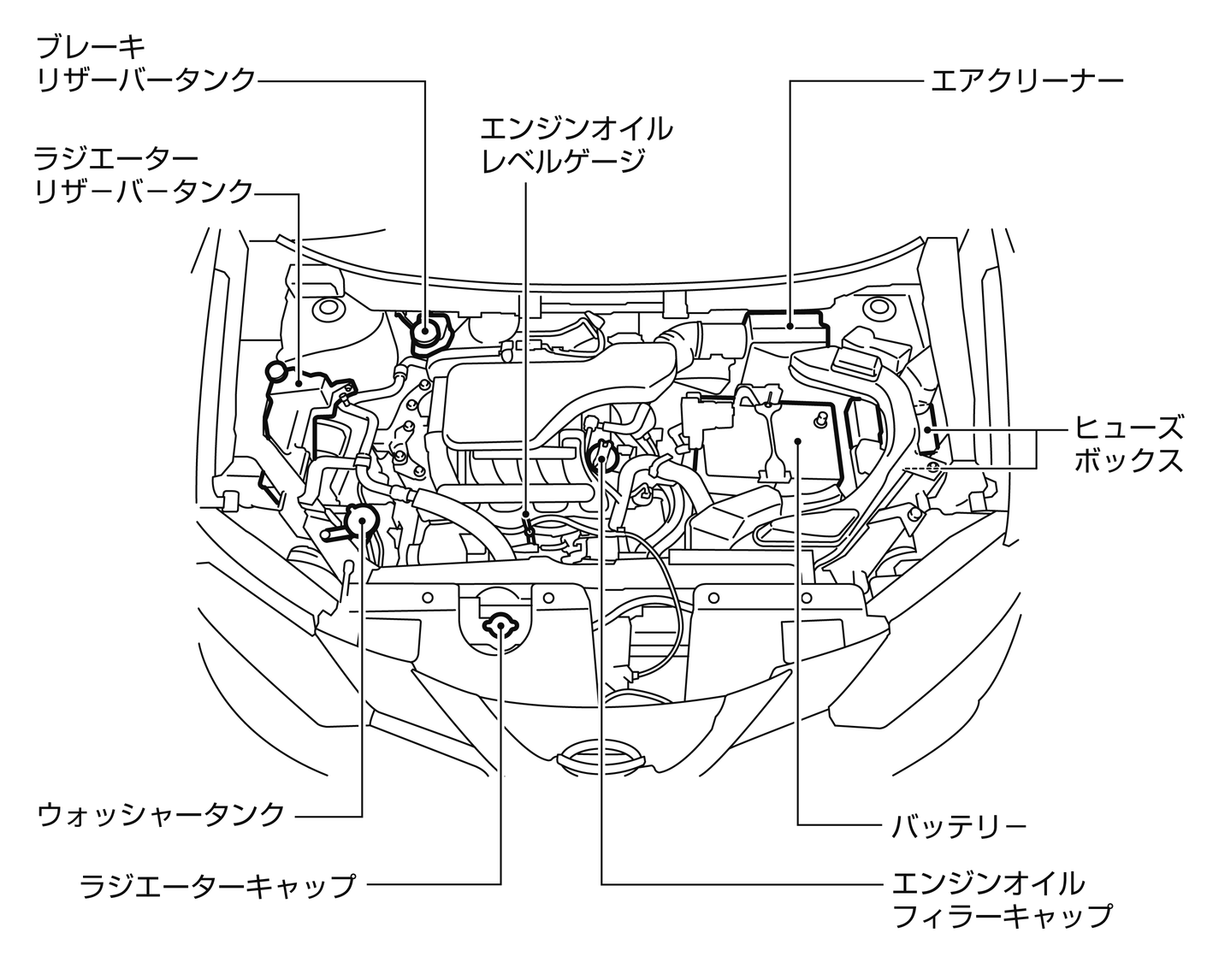 点検や清掃に使用した工具、布、紙類などを、エンジンルーム内に置き忘れないようにしてください。故障や車両火災につながるおそれがあります。