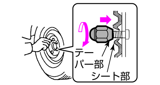 ナットのテーパー部が、ホイール穴のシート部に軽く当たるくらいまで、時計回りに回して締め付けます。