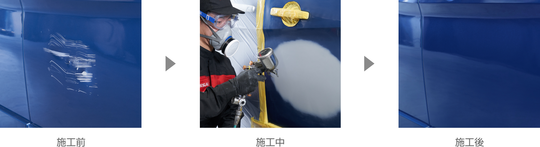 日産の施工認定を受けたプロの技術者が、通常板金と同じスプレーガン方式で塗装。