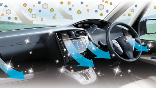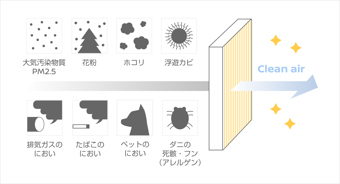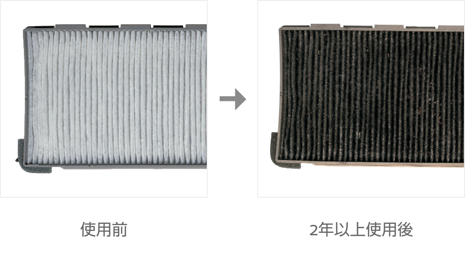 外気から取り込む空気を清浄するのと同時に、車内の空気循環で室内に入った花粉もキャッチします。
