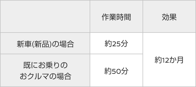 - ※効果持続時間は目安です。おクルマの使用環境により、若干異なる場合があります。