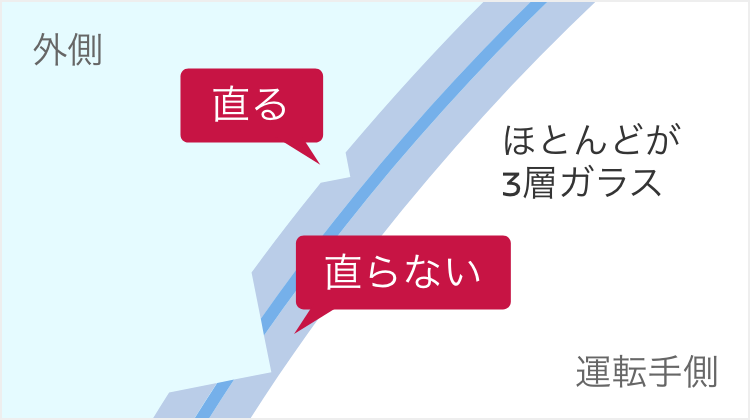 - 合わせガラスの中間膜までキズが達している場合やフロントガラスのふちに近い部分(約5㎝)のキズは補修不可。
