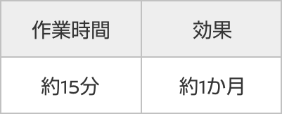 - ※効果持続時間は目安です。おクルマの使用環境により、若干異なる場合があります。