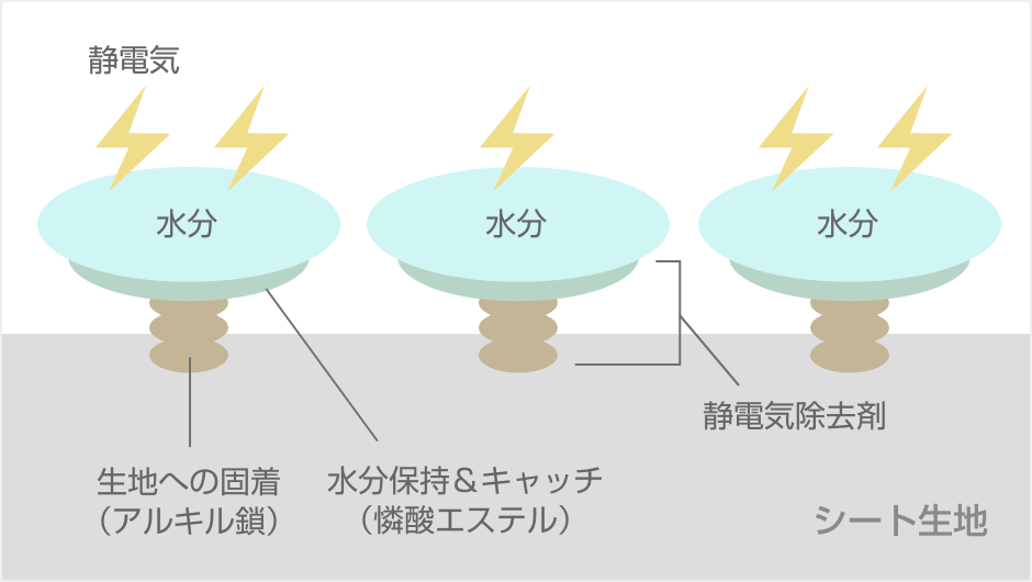 静電気除去成分が強固に空気中の水分を保持することで静電気除去効果を発揮します。