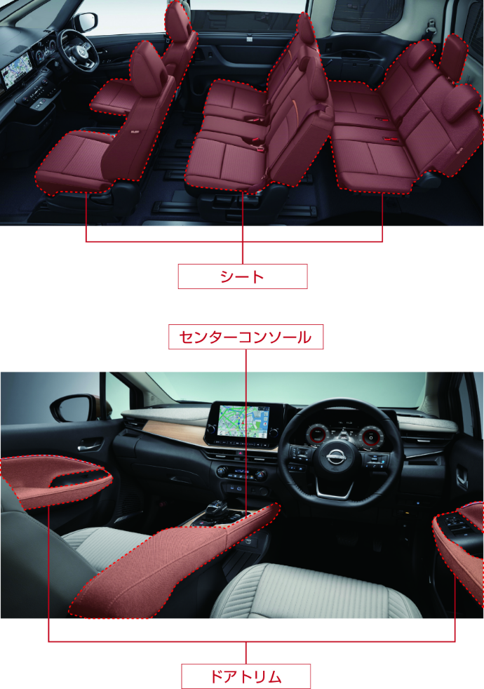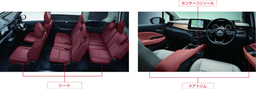 施工範囲はシート、アームレスト、センターコンソール、ドアトリムです。