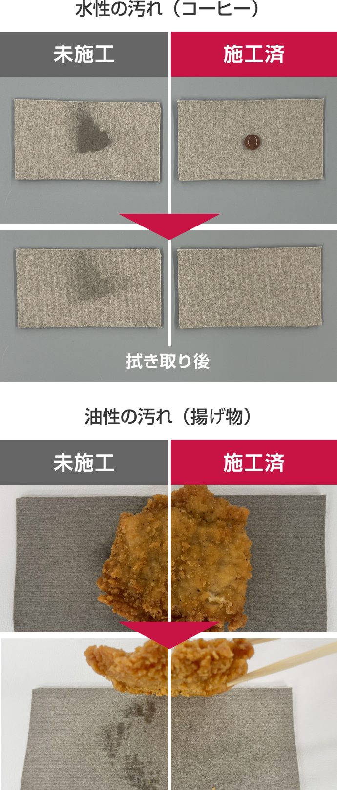 ファブリック、レザーそれぞれの素材に合わせた特殊なコーティング被膜を形成し、