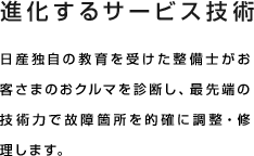そのクルマに、最先端のアフターサービスを。 私たちが目指すのは、クルマとともに進化するアフターサービス。日々変わる最先端の技術をいち早く、より深く修得し、お客さまが心から安心できるサービスを提供していきます。